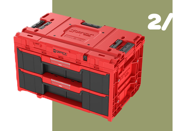 Caja de herramientas modular Qbrick System ONE Drawer 2 Plus con dos cajones con divisores ajustables, conectores laterales para módulos adicionales y opción de cierre con candado.